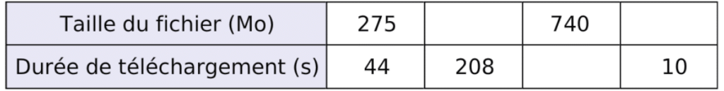 Avec la fibre, le débit Internet est très élevé. Il permet en théorie de charger jusqu’à 100 Mo de données en 4 secondes. Compléter le tableau suivant qui donne le temps de téléchargement de plusieurs types de fichiers :